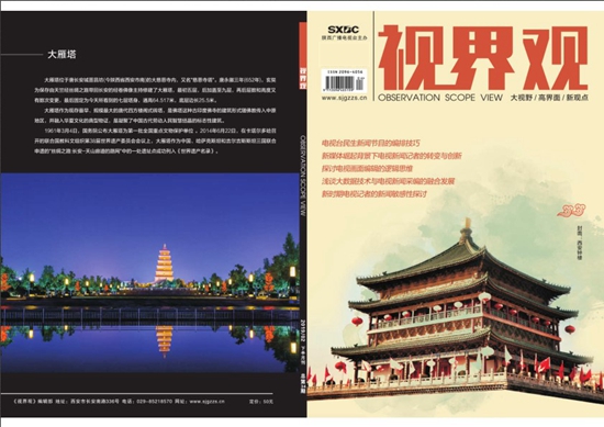 《视界观》杂志是经国家广播电视总局批准,由陕西省广播电视局主管、陕西广播电视台主办的大型文化艺术新闻类专业学术理论期刊,国内统一刊号:CN 61-1508/J,国际标准刊号:ISSN 2096-4056,广告发布编号:61011320170058,邮发代号:52-331。主要栏目设置:1.视:新闻视界、视界历史、视界大观、经济文化;2.界:文化研究、艺术探讨、视界探索、影视大观;3.观:文化传播、传媒观察、艺术观赏、文化论坛等。